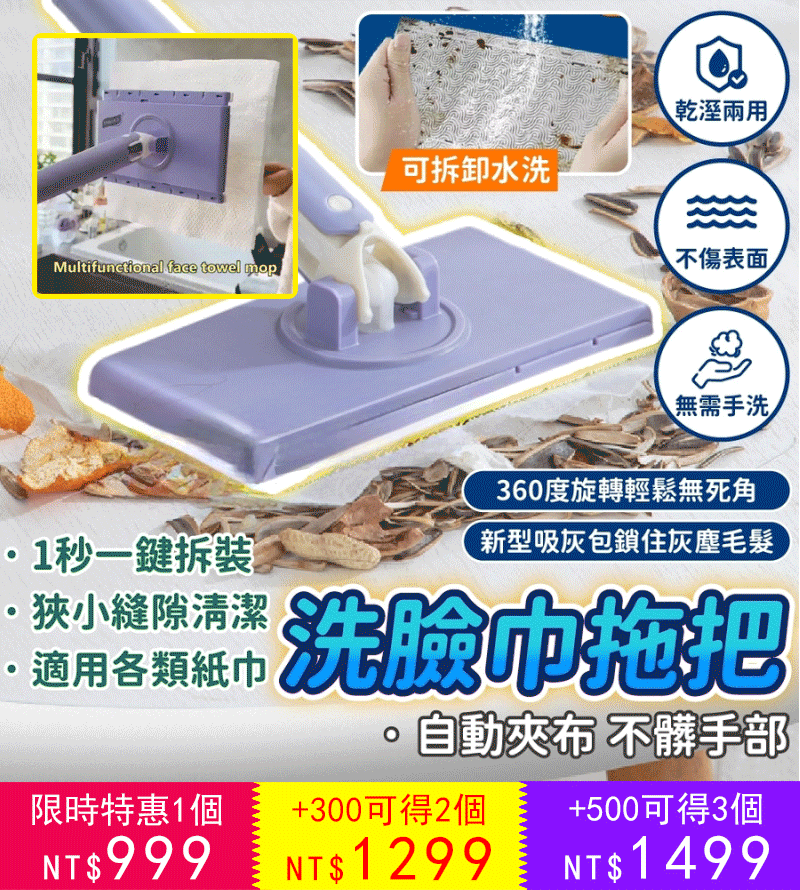 12分鐘前【2024設計獎得獎上新】免手洗懒人伸縮拖把,新升級設計,不在擔心拖把不好弄,新升級長度設計,同時不沾手放人工擰拖把,使打掃變得簡單 - 【今日限定 買一送一 2把+ 拖布*2包 】-NT$999